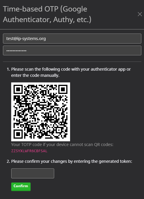 Scannen Sie den QR-Code mit der Authenticator App. Sie erhalten dann einen 6 stelligen Code, den Sie im Textfeld oberhalb von "Confirm" eintragen, und mit "Confirm" bestätigen.