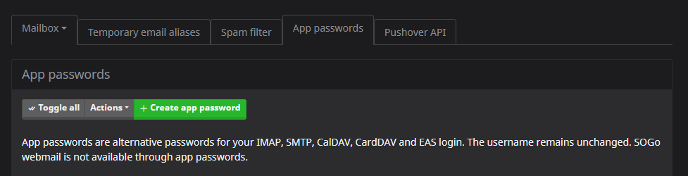 Hinweis Falls Sie RoundCube als Webmail benutzen wollen, müssen Sie dafür auch ein eigenes App-Passwort anlegen. Wir empfehlen aber stattdessen die Verwendung von SoGo als Webmail, da dieses die 2FA unterstützt.