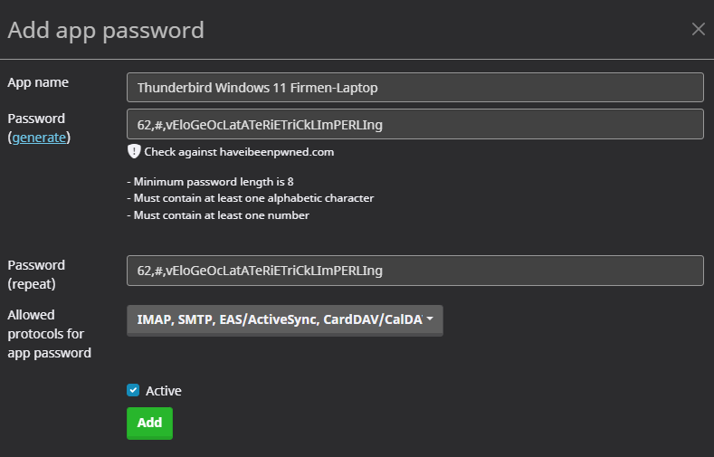 Vergeben Sie einen aussagekräftigen Namen für die App, am besten generieren Sie ein Passworrt mit dem "generate" Button: