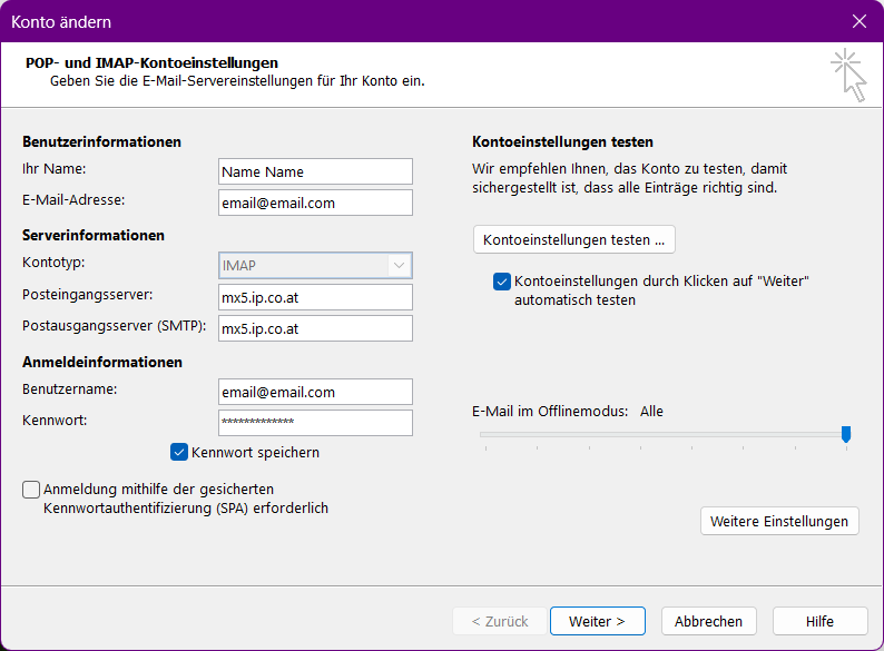 - Posteingangserver + Postausgangsserver: mx5.ip.co.at