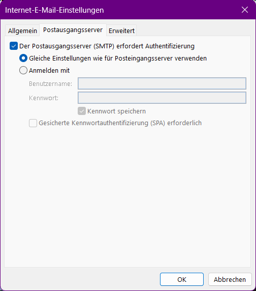 Postausgangsserver / wählen Sie "der Postausgangserver ...."